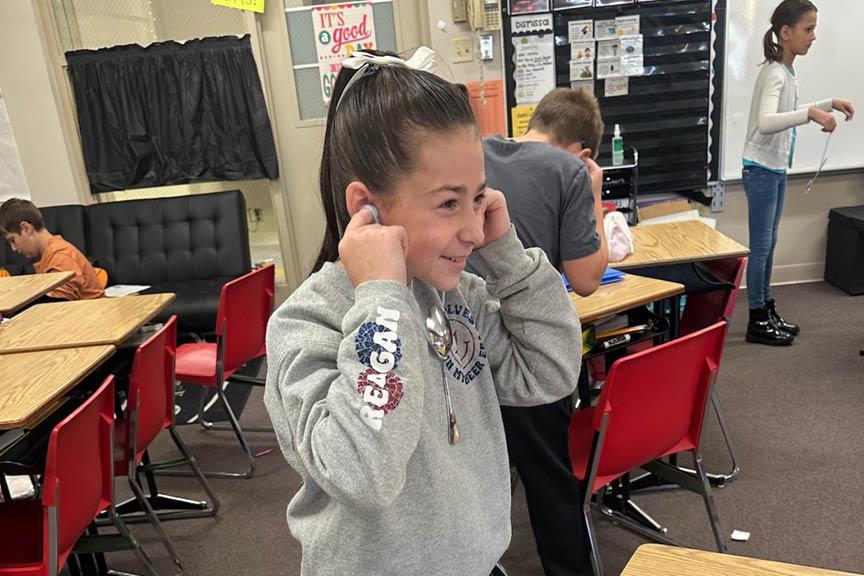 At McCullough Elementary School, Mrs. Coleman’s 4th-grade students are studying energy transfer. In a hands-on activity, they used their own ‘spoon bells’ to create sound waves using yarn and spoons. The students were able to compare how sound energy travels through different media, such as metal and plastic.